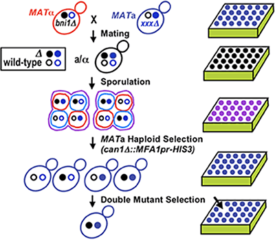 Our laboratory employs the budding yeast, S. cerevisiae, as a model to investigate the basic principles of genetic interaction networks. Most yeast genes are not required for viability indicating that essential processes are regulated by multiple compensatory pathways. Synthetic lethality defines a relationship where two mutations, neither of which is lethal on its own, result in cell death when combined. Identification of synthetically lethal double mutant combinations is of particular interest because they can identify genes whose products impinge on the same essential biological process. An alternate interpretation of synthetic lethality defines a relationship where the presence of one gene allows an organism to tolerate genetic variation in a different gene. Thus, genetic interaction maps provide valuable insights into the concept of genetic robustness, that is, how an organism is able to buffer or tolerate the phenotypic consequences of genetic variation.